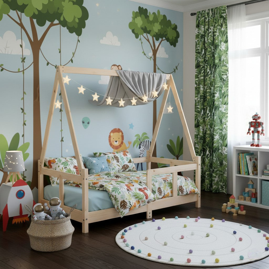 Nous utilisons exclusivement du bois de pin massif brut et naturel pour sa durabilité et son aspect authentique. Il est généralement non traité, ou bénéficie d'une finition écologique et sans danger pour les enfants, conforme aux normes européennes en vigueur. Nous privilégions les matériaux sains pour le bien-être de votre enfant.