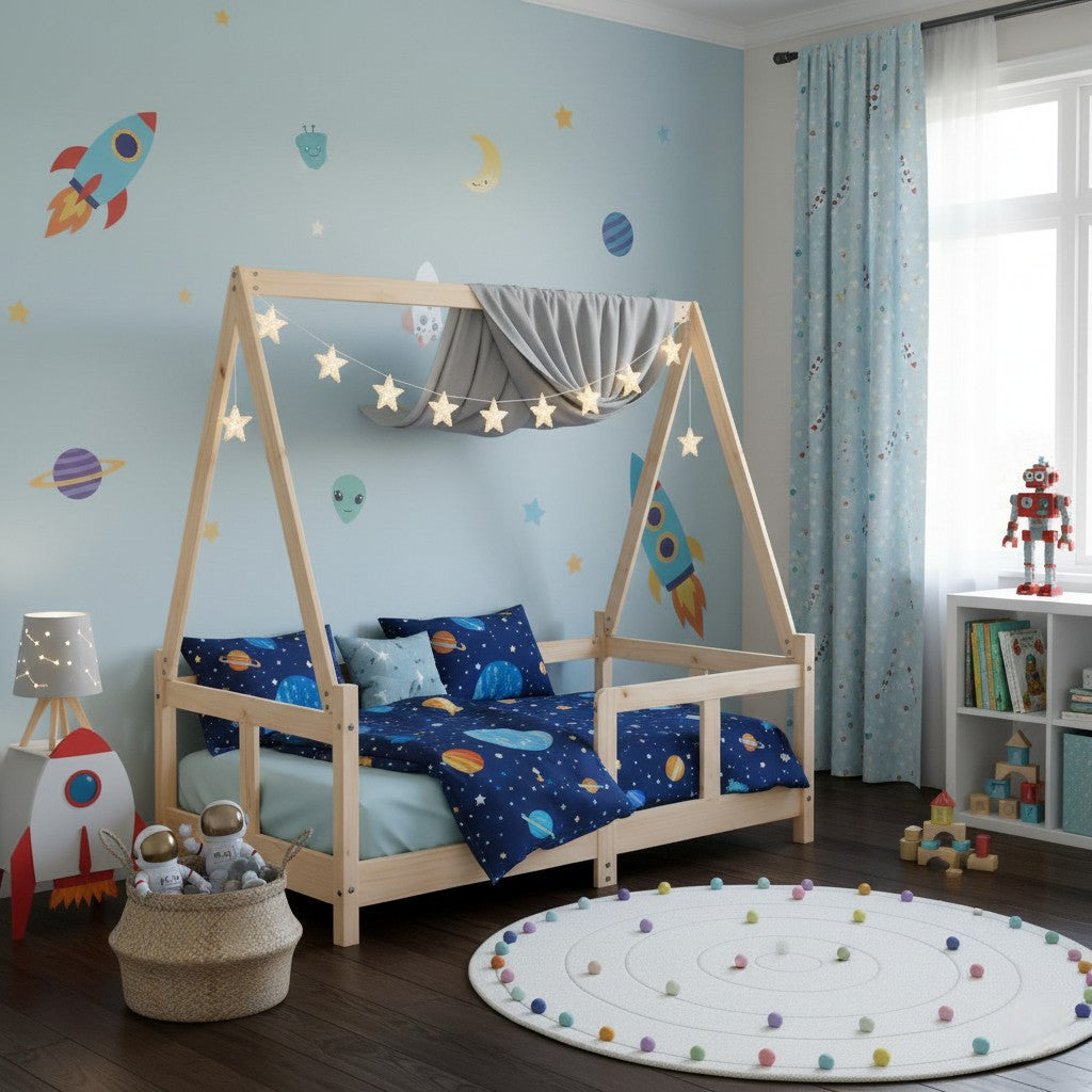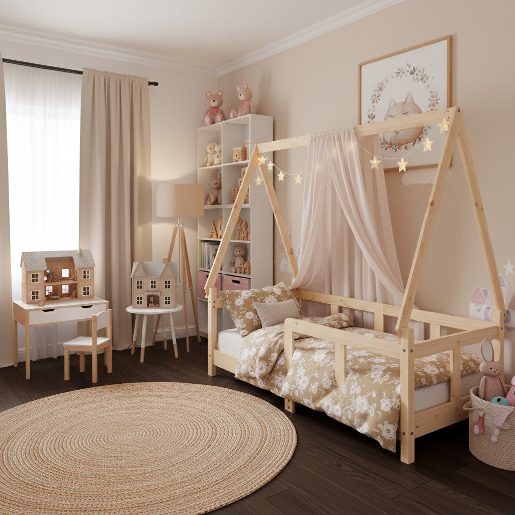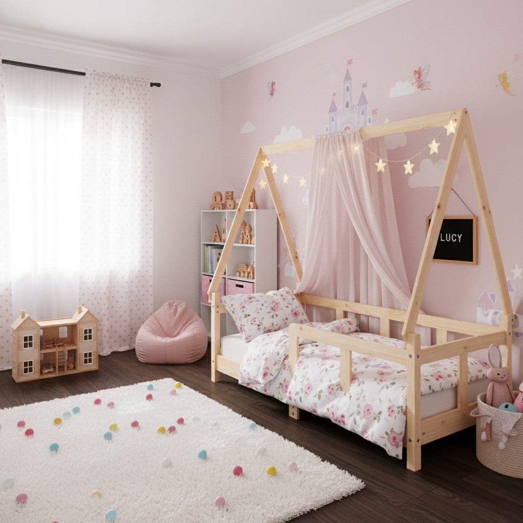 Avec son design en forme de petite maison, ce lit invite à l’imagination. Il vous permet d’y suspendre des rideaux pour créer un cocon douillet, parfait pour lire, rêver ou se reposer.